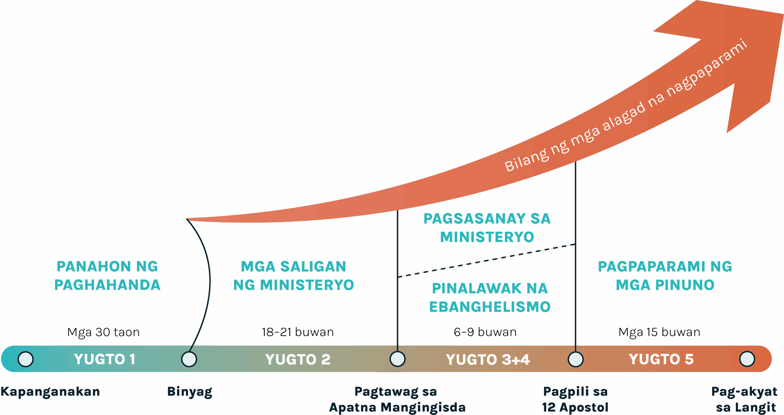 Makikilala ang mga yugto kung itatanong ng mambabasa sa kanyang sarili ang sumusunod na tanong kapag pinag-aaralan ang mga ito: Paano pinasimulan ni Jesus ang isang multiplicative discipleship movement? Ang gawain na inatasang gawin ni Jesus ng Kanyang Ama ay upang sanayin ang mga disipulo na maaaring dalhin ang mensahe ng krus sa mundo (Juan 17 / Mateo 28). Ang bawat yugto ay binigyan ng pamagat na naglalarawan kung ano ang kani-kanilang layunin ng yugto. Ang sumusunod na diagram ay isang pangkalahatang-ideya ng limang yugtong pinagdaanan ni Hesus noong ilunsad niya ang multiplicative discipleship movement.